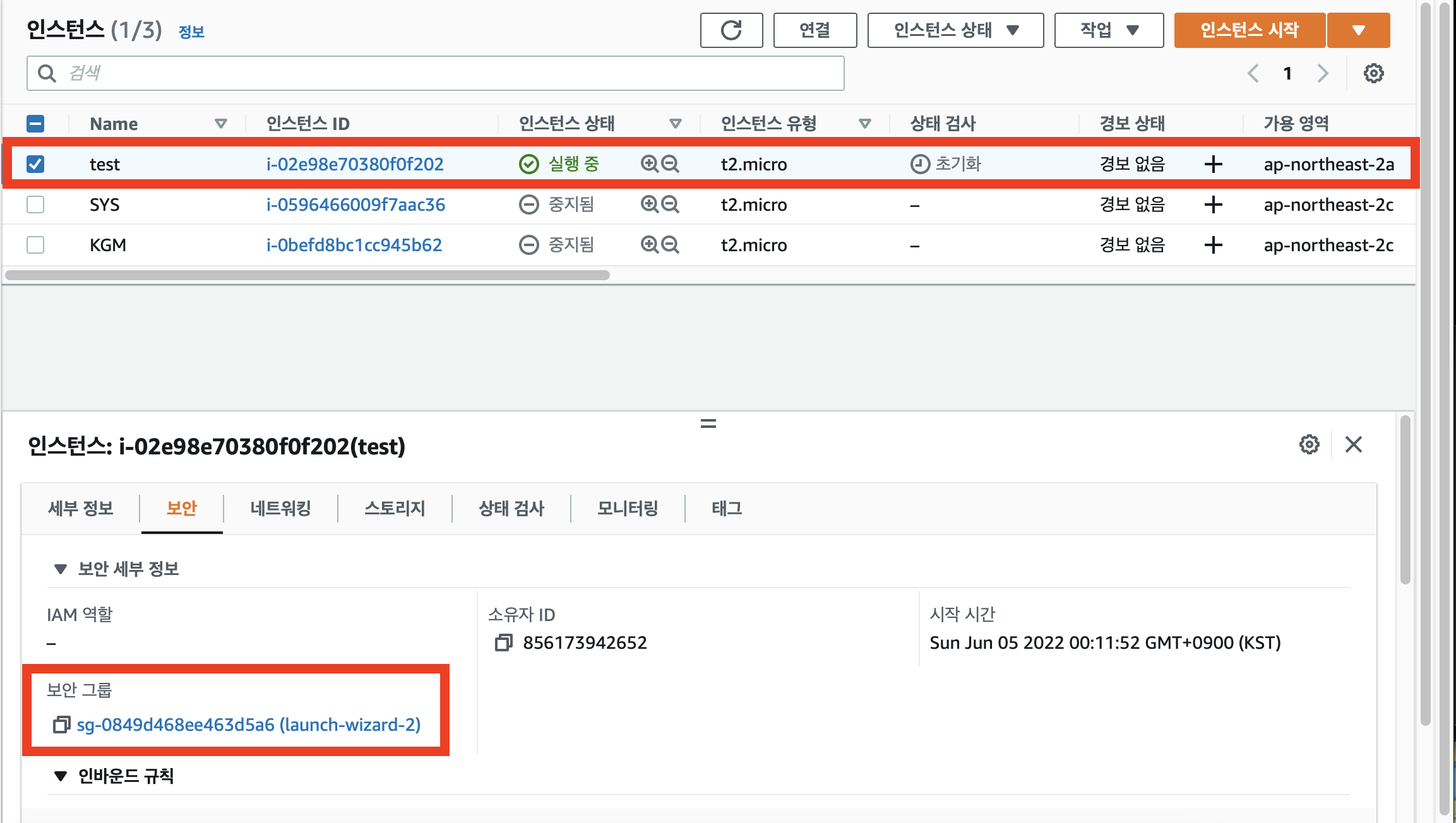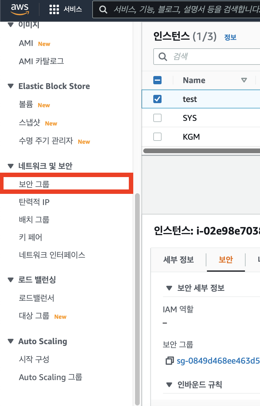 1. 실행중인 AWS 인스턴스에 접속하여 보안 그룹명을 확인해준다. (위 사진에서는 launch-wizard-2 이다.)