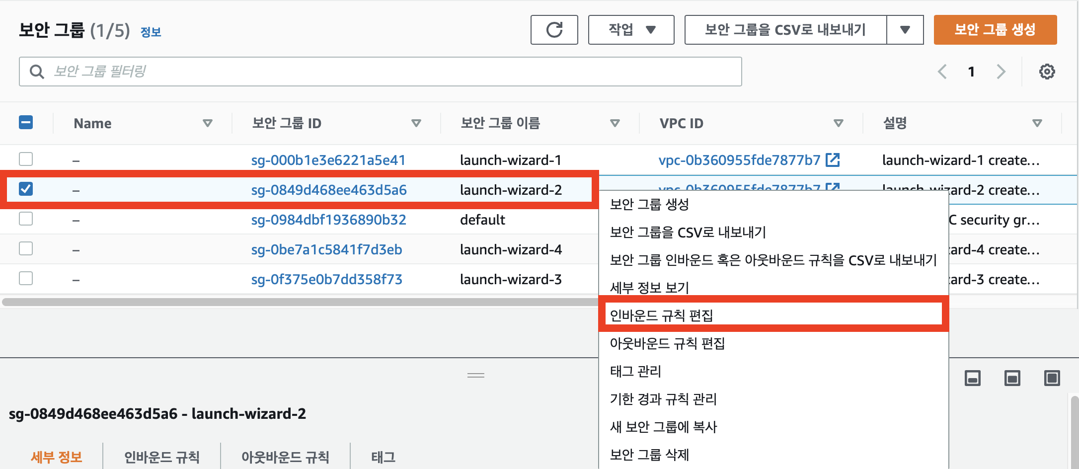 3. 이전에 확인했던 보안 그룹명을 마우스 우클릭 해서 '인바운드 규칙 편집'을 클릭한다.