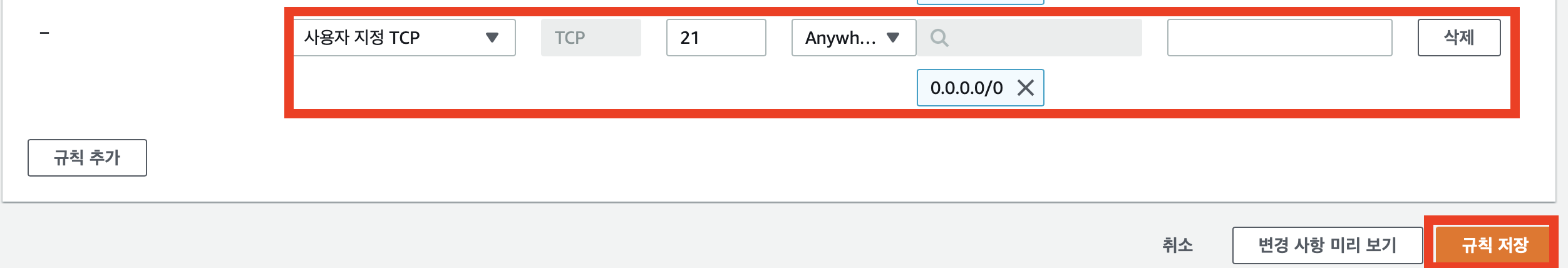 5. 첫번째 칸은 '사용자 지정 TCP'를 선택해주고, 세번째 칸에서 21번 또는 22번 포트를 입력하고, 4번째 칸에 'Anywhere-IPv4'를 선택 후에 '규칙 저장'을 클릭하여 규칙 추가를 마무리 한다.