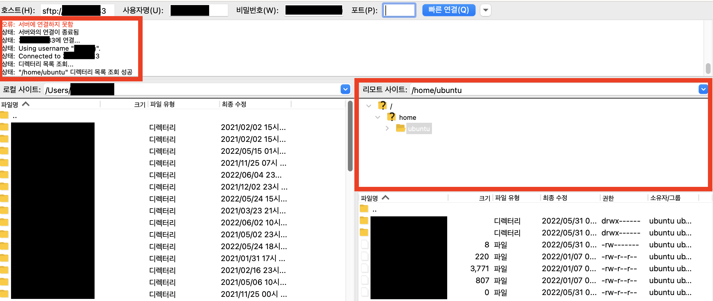 9. 아래 '리모트 사이트' 부분을 확인하게 되면 사용자명에 입력했던 계정의 홈 디렉터리로 진입한 것을 확인할 수 있다.