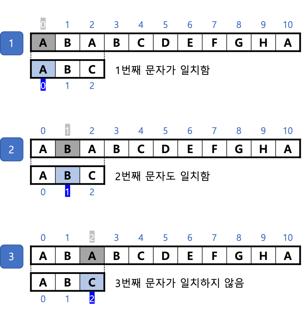 과정 3에서는 텍스트쪽의 검사 위치가 2번 인덱스까지 나아갔지만 과정 4에서는 1번 인덱스로 되돌아오는 것을 볼 수 있다.