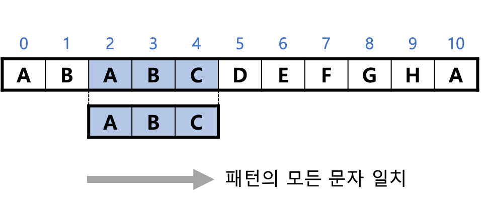 패턴의 문자 "A", "B", "C"와 텍스트의 문자 "A", "B", "C"가 모두 일치하므로 검색에 성공한다.