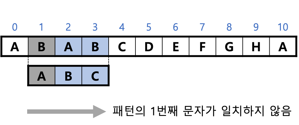 패턴의 첫 문자 "A"와 텍스트의 문자 "B"가 일치하지 않으므로 패스한다.