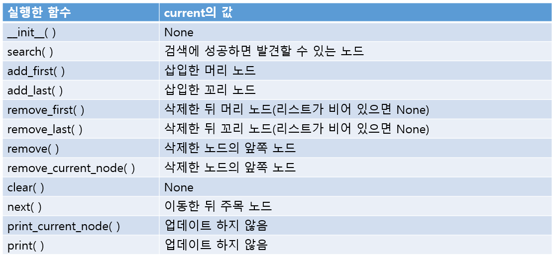 - current: 현재 주목하고 있는 노드에 대한 참조이며, 주목 포인터라고 부를 수 있음. 리스트에서 노드를 검색하여 그 노드를 주목한 직후에 노드를 삭제하는 등의 용도로 사용