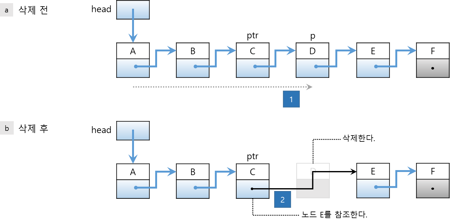 데이터 삭제도 데이터 추가와 같은 방식으로 진행된다. 포인터의 방향만 바꾸어주면 된다.