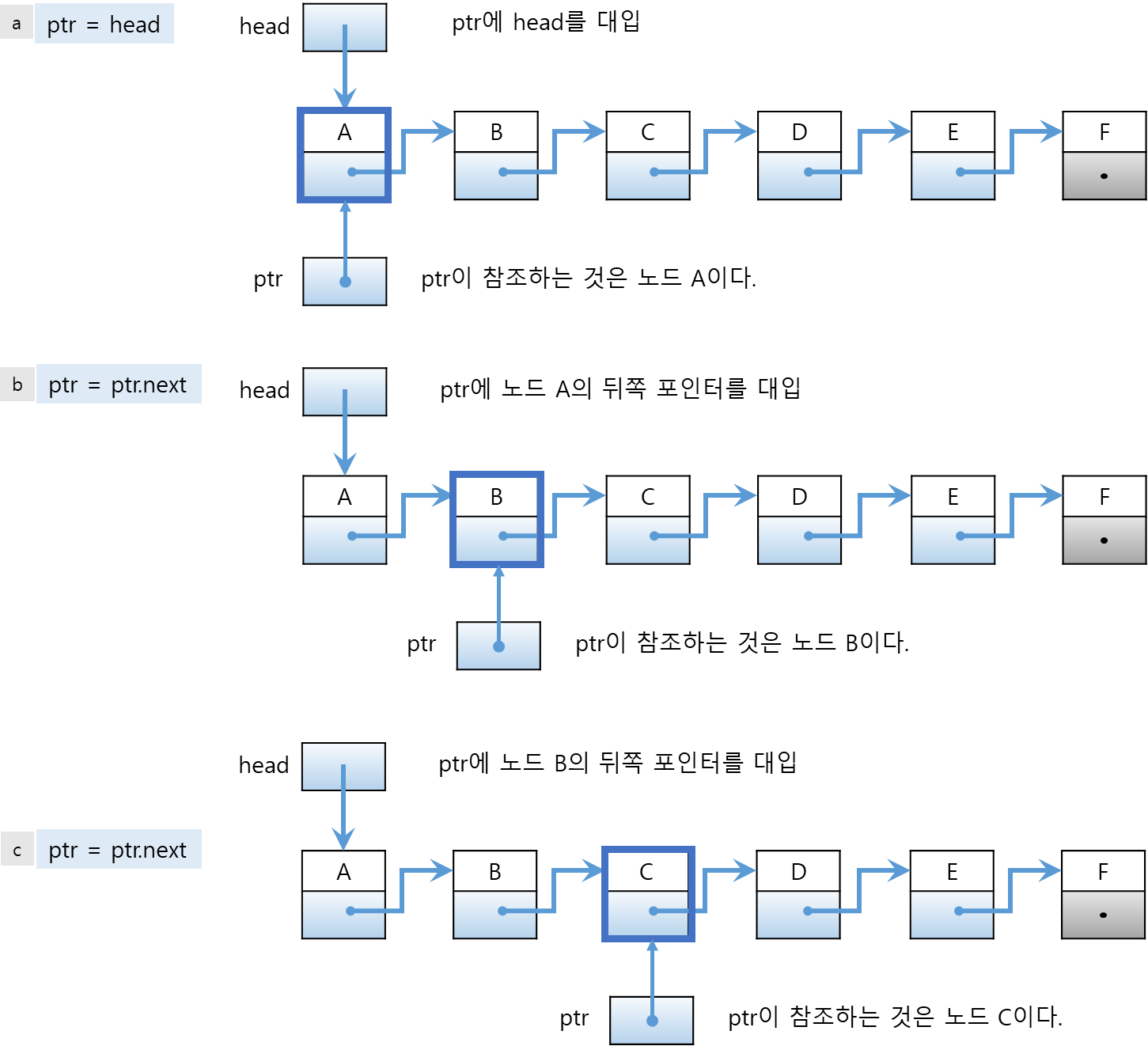 다시 말하면 흩어져서 저장돼 있으므로 포인터를 처음부터 순서대로 따라가야만 원하는 데이터에 접근할 수 있다.