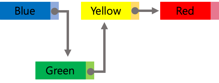 'Blue'의 포인터를 'Green'을 가리키도록 변경하고, 'Green'의 포인터를 'Yellow'를 다음 그림과 같이 가리키도록 하면 데이터 추가가 완료된다.