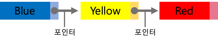 위 그림이 리스트의 개념도이다. 여기서는 세 개의 문자열 'Blue', 'Yellow', 'Red'가 데이터로 저장되어 있다.